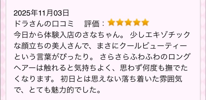 今日から体験入店のさなちゃん。 少しエキゾチックな顔立ちの美人さんで、まさにクールビューティーという言葉がぴったり。 さらさらふわふわのロングヘアーは触れると気持ちよく、思わず何度も撫でたくなります。 初日とは思えない落ち着いた雰囲気で、とても魅力的でした。